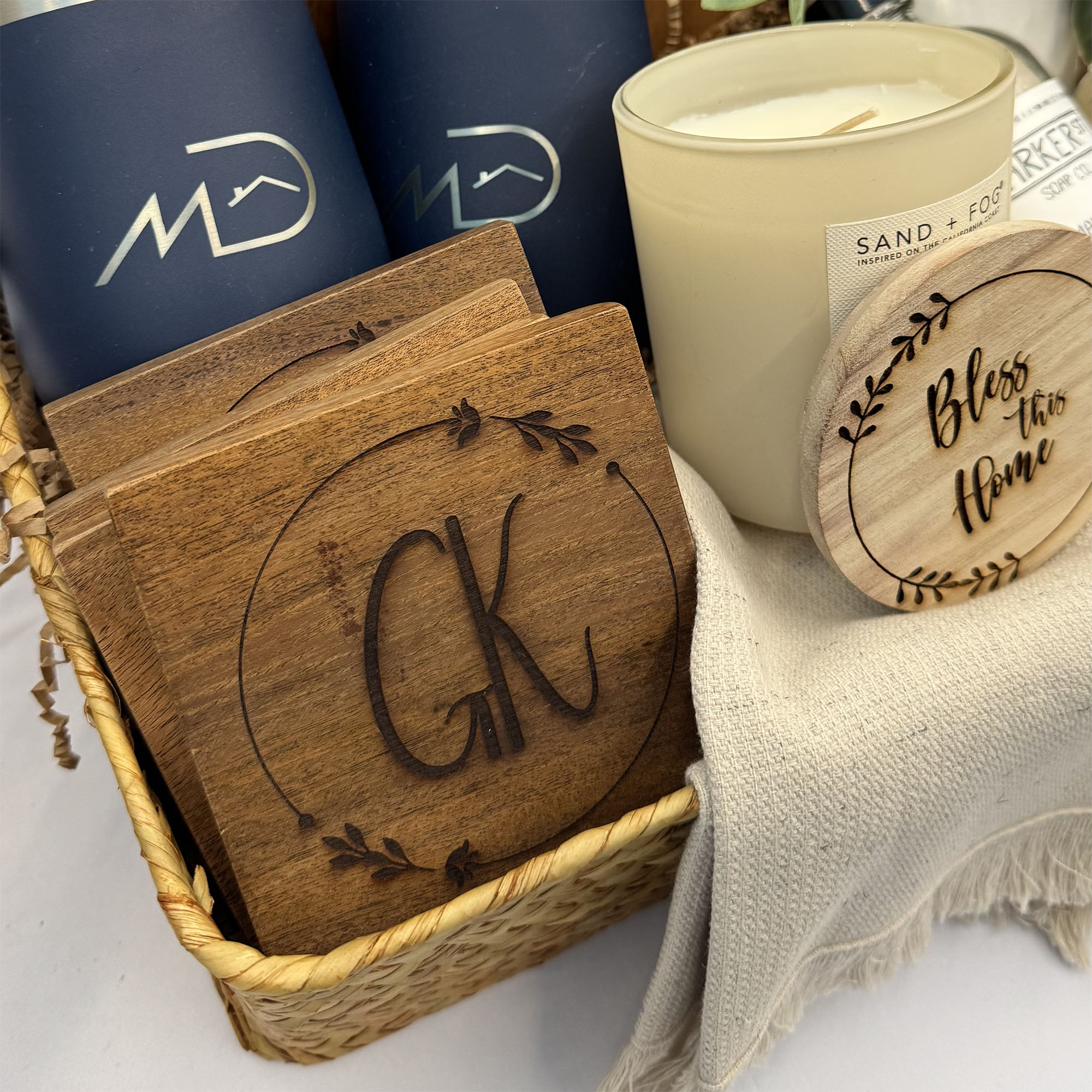 Personalized Rustic Housewarming Gift Basket for Couples | Custom Wood Board, Tumbler Set, Initials Coasters & Home Spa Kit