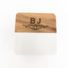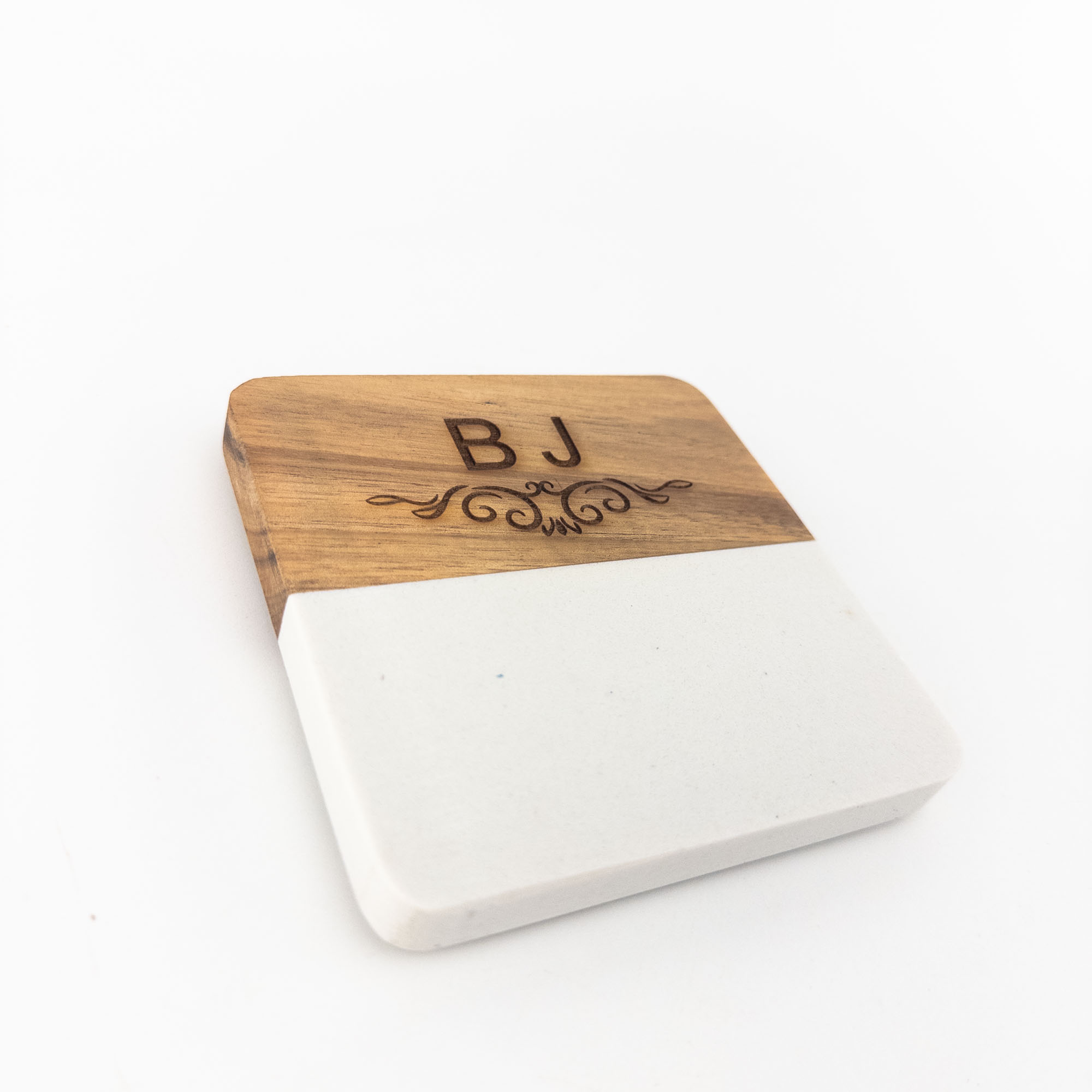 The design features a chic split of luxurious white marble and warm, durable acacia wood. The wood section is custom-engraved with up to two initials (e.g., “BJ”) and an elegant decorative scroll, making this set a sophisticated addition to any coffee table or bar cart.