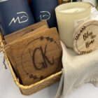 - Coaster Set: A set of rustic wood coasters personalized with a couple’s initials (e.g., “GK”) and an elegant wreath design.